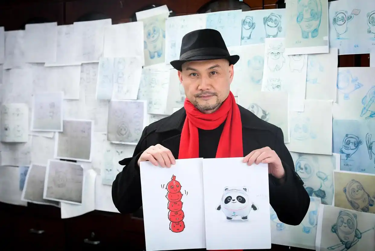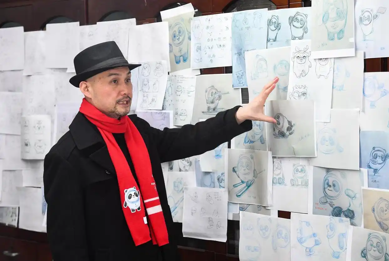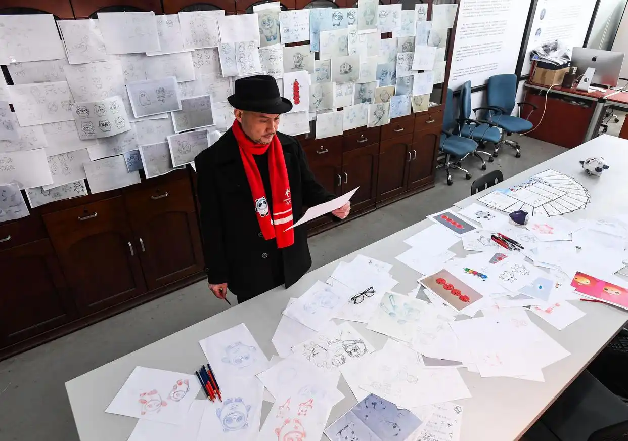 广州美术学院,视觉艺术设计学院,有一位副教授叫做刘平云,他的工作室里,至今留存着厚厚一叠设计手稿。2022年2月9日,他向新华社记者展示这些手稿,从最初的冰糖葫芦造型,到最后定稿的冰墩墩,中间历经了上千次修改。最初团队想用冰糖葫芦代表北京传统小吃,不过考虑到承载能力有限,最终保留了外层冰晶的创意,把内核换成了中国国宝熊猫。